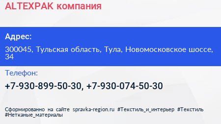 ALTEXPAK, компания по адресу 300045, Тульская область, Тула, Новомосковское шоссе, 34 в дальнейшем Организация, размещена в следующих категориях: