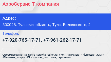 АэроСервис-Т, компания по адресу 300028, Тульская область, Тула, Волнянского, 2 в дальнейшем Организация, размещена в следующих категориях: