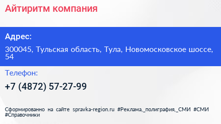Айтиритм, компания по адресу 300045, Тульская область, Тула, Новомосковское шоссе, 54 в дальнейшем Организация, размещена в следующих категориях: