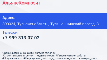 АльянсКомпозит по адресу 300024, Тульская область, Тула, Иншинский проезд, 3 в дальнейшем Организация, размещена в следующих категориях: