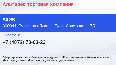 Альтарес, торговая компания по адресу 300041, Тульская область, Тула, Советская, 17Б в дальнейшем Организация, размещена в следующих категориях: