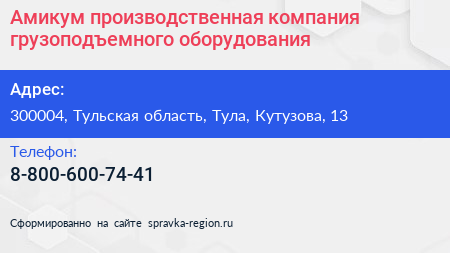 Амикум, производственная компания грузоподъемного оборудования по адресу 300004, Тульская область, Тула, Кутузова, 13 в дальнейшем Организация, размещена в следующих категориях: