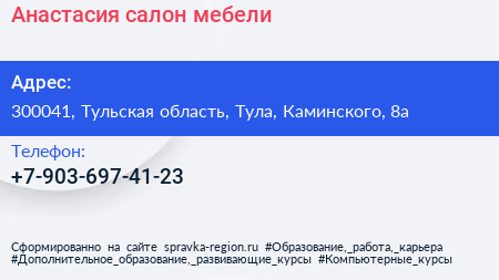 Анастасия, салон мебели по адресу 300041, Тульская область, Тула, Каминского, 8а в дальнейшем Организация, размещена в следующих категориях: