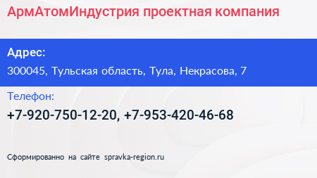 АрмАтомИндустрия, проектная компания по адресу 300045, Тульская область, Тула, Некрасова, 7 в дальнейшем Организация, размещена в следующих категориях: