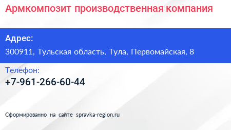 Армкомпозит, производственная компания по адресу 300911, Тульская область, Тула, Первомайская, 8 в дальнейшем Организация, размещена в следующих категориях: