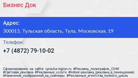 Бизнес-Док по адресу 300013, Тульская область, Тула, Московская, 19 в дальнейшем Организация, размещена в следующих категориях: