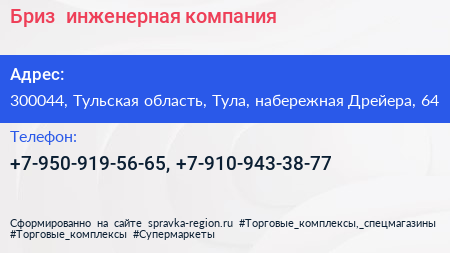 Бриз+, инженерная компания по адресу 300044, Тульская область, Тула, набережная Дрейера, 64 в дальнейшем Организация, размещена в следующих категориях: