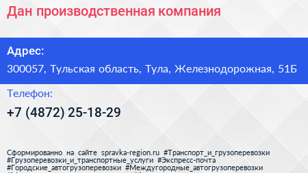 Дан, производственная компания по адресу 300057, Тульская область, Тула, Железнодорожная, 51Б в дальнейшем Организация, размещена в следующих категориях: