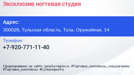 Эксклюзив, ногтевая студия по адресу 300028, Тульская область, Тула, Оружейная, 14 в дальнейшем Организация, размещена в следующих категориях: