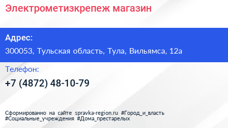 Электрометизкрепеж, магазин по адресу 300053, Тульская область, Тула, Вильямса, 12а в дальнейшем Организация, размещена в следующих категориях: