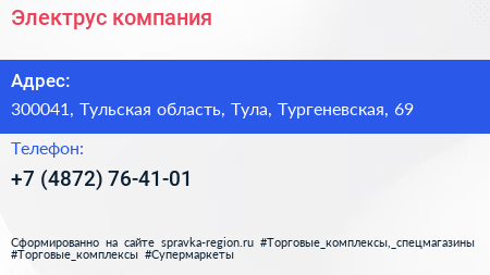 Электрус, компания по адресу 300041, Тульская область, Тула, Тургеневская, 69 в дальнейшем Организация, размещена в следующих категориях: