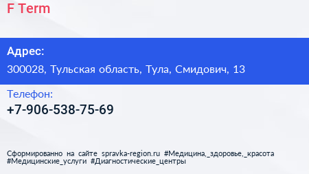 F-Tеrm по адресу 300028, Тульская область, Тула, Смидович, 13 в дальнейшем Организация, размещена в следующих категориях: