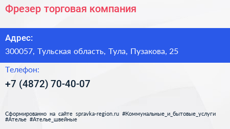 Фрезер, торговая компания по адресу 300057, Тульская область, Тула, Пузакова, 25 в дальнейшем Организация, размещена в следующих категориях: