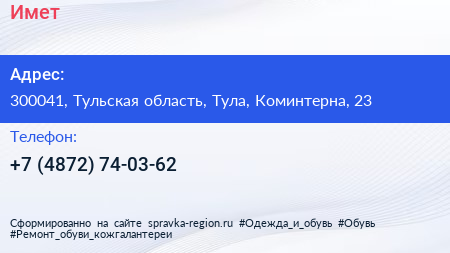 Имет по адресу 300041, Тульская область, Тула, Коминтерна, 23 в дальнейшем Организация, размещена в следующих категориях: