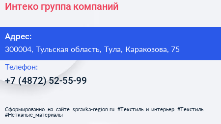 Интеко, группа компаний по адресу 300004, Тульская область, Тула, Каракозова, 75 в дальнейшем Организация, размещена в следующих категориях:
