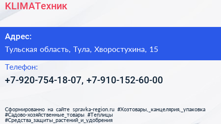 KLIMAТехник по адресу Тульская область, Тула, Хворостухина, 15 в дальнейшем Организация, размещена в следующих категориях: