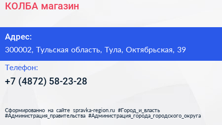КОЛБА, магазин по адресу 300002, Тульская область, Тула, Октябрьская, 39 в дальнейшем Организация, размещена в следующих категориях: