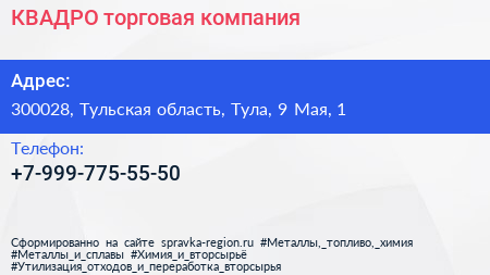 КВАДРО, торговая компания по адресу 300028, Тульская область, Тула, 9 Мая, 1 в дальнейшем Организация, размещена в следующих категориях: