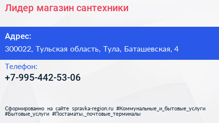 Лидер, магазин сантехники по адресу 300022, Тульская область, Тула, Баташевская, 4 в дальнейшем Организация, размещена в следующих категориях: