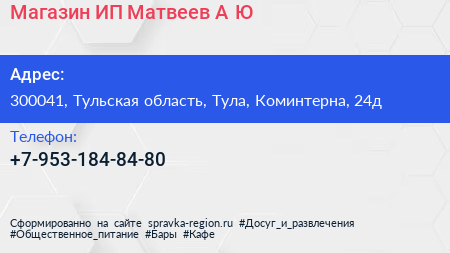 Магазин, ИП Матвеев А.Ю. по адресу 300041, Тульская область, Тула, Коминтерна, 24д в дальнейшем Организация, размещена в следующих категориях: