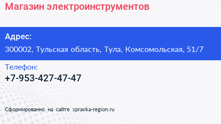 Магазин электроинструментов по адресу 300002, Тульская область, Тула, Комсомольская, 51/7 в дальнейшем Организация, размещена в следующих категориях: