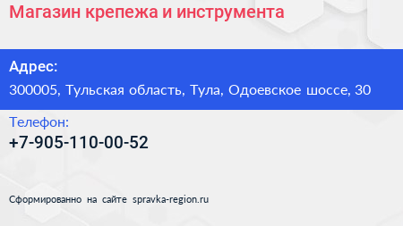 Магазин крепежа и инструмента по адресу 300005, Тульская область, Тула, Одоевское шоссе, 30 в дальнейшем Организация, размещена в следующих категориях: