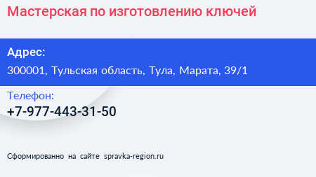 Мастерская по изготовлению ключей по адресу 300001, Тульская область, Тула, Марата, 39/1 в дальнейшем Организация, размещена в следующих категориях: