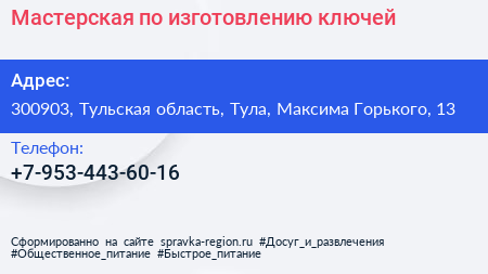 Мастерская по изготовлению ключей по адресу 300903, Тульская область, Тула, Максима Горького, 13 в дальнейшем Организация, размещена в следующих категориях: