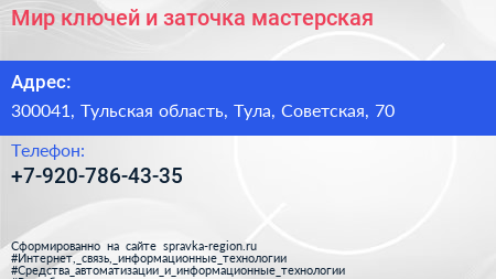 Мир ключей и заточка, мастерская по адресу 300041, Тульская область, Тула, Советская, 70 в дальнейшем Организация, размещена в следующих категориях: