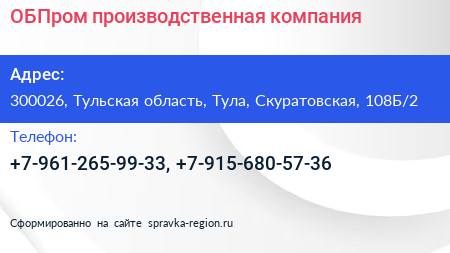 ОБПром, производственная компания по адресу 300026, Тульская область, Тула, Скуратовская, 108Б/2 в дальнейшем Организация, размещена в следующих категориях: