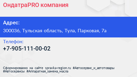 ОндатраPRO, компания по адресу 300036, Тульская область, Тула, Парковая, 7а в дальнейшем Организация, размещена в следующих категориях: