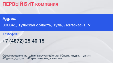 ПЕРВЫЙ БИТ, компания по адресу 300041, Тульская область, Тула, Лейтейзена, 9 в дальнейшем Организация, размещена в следующих категориях: