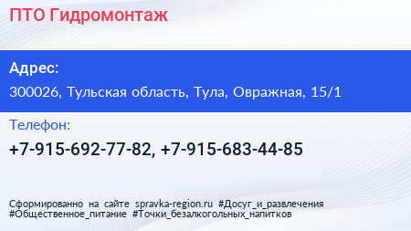 ПТО-Гидромонтаж по адресу 300026, Тульская область, Тула, Овражная, 15/1 в дальнейшем Организация, размещена в следующих категориях: