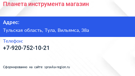 Планета инструмента, магазин по адресу Тульская область, Тула, Вильямса, 38а в дальнейшем Организация, размещена в следующих категориях: