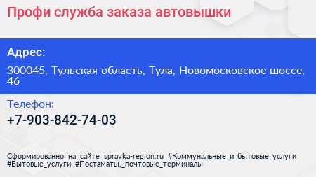 Профи, служба заказа автовышки по адресу 300045, Тульская область, Тула, Новомосковское шоссе, 46 в дальнейшем Организация, размещена в следующих категориях: