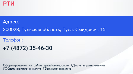 РТИ по адресу 300028, Тульская область, Тула, Смидович, 15 в дальнейшем Организация, размещена в следующих категориях: