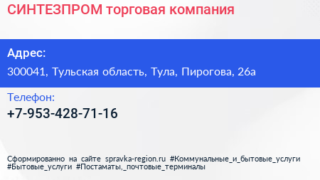 СИНТЕЗПРОМ, торговая компания по адресу 300041, Тульская область, Тула, Пирогова, 26а в дальнейшем Организация, размещена в следующих категориях: