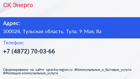СК Энерго по адресу 300028, Тульская область, Тула, 9 Мая, 8а в дальнейшем Организация, размещена в следующих категориях: