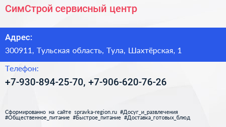 СимСтрой, сервисный центр по адресу 300911, Тульская область, Тула, Шахтёрская, 1 в дальнейшем Организация, размещена в следующих категориях: