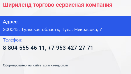 Шириленд, торгово-сервисная компания по адресу 300045, Тульская область, Тула, Некрасова, 7 в дальнейшем Организация, размещена в следующих категориях:
