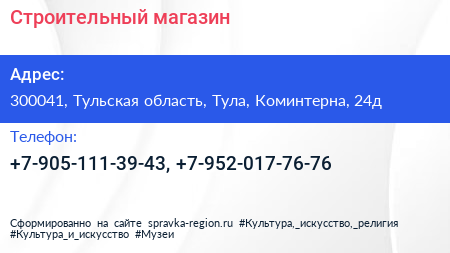 Строительный магазин по адресу 300041, Тульская область, Тула, Коминтерна, 24д в дальнейшем Организация, размещена в следующих категориях: