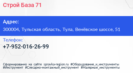 Строй База 71 по адресу 300004, Тульская область, Тула, Венёвское шоссе, 51 в дальнейшем Организация, размещена в следующих категориях: