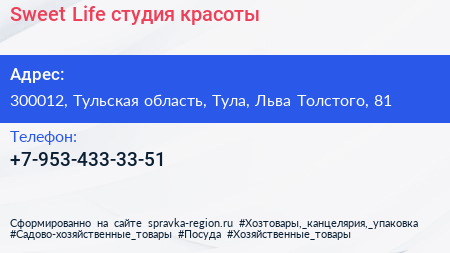 Sweet Life, студия красоты по адресу 300012, Тульская область, Тула, Льва Толстого, 81 в дальнейшем Организация, размещена в следующих категориях: