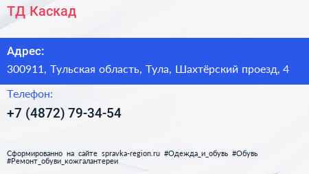 ТД Каскад по адресу 300911, Тульская область, Тула, Шахтёрский проезд, 4 в дальнейшем Организация, размещена в следующих категориях: