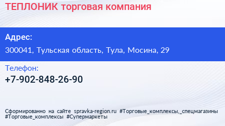 ТЕПЛОНИК, торговая компания по адресу 300041, Тульская область, Тула, Мосина, 29 в дальнейшем Организация, размещена в следующих категориях: