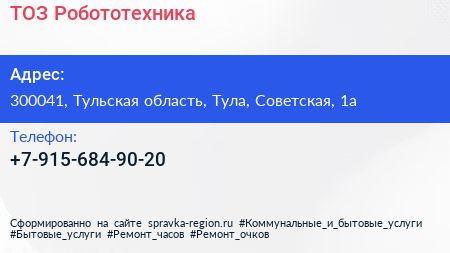 ТОЗ-Робототехника по адресу 300041, Тульская область, Тула, Советская, 1а в дальнейшем Организация, размещена в следующих категориях: