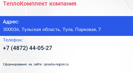 ТеплоКомплект, компания по адресу 300036, Тульская область, Тула, Парковая, 7 в дальнейшем Организация, размещена в следующих категориях: