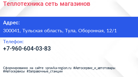 Теплотехника, сеть магазинов по адресу 300041, Тульская область, Тула, Оборонная, 12/1 в дальнейшем Организация, размещена в следующих категориях: