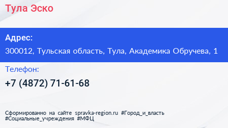 Тула Эско по адресу 300012, Тульская область, Тула, Академика Обручева, 1 в дальнейшем Организация, размещена в следующих категориях: