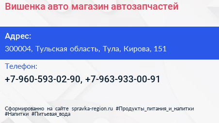 Вишенка авто, магазин автозапчастей по адресу 300004, Тульская область, Тула, Кирова, 151 в дальнейшем Организация, размещена в следующих категориях: